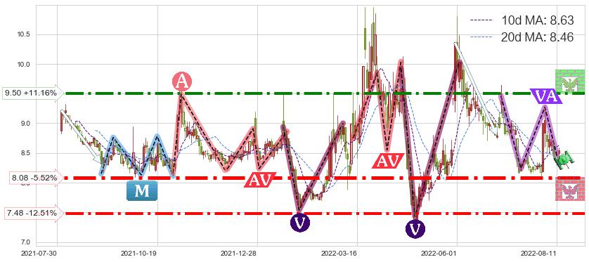 ♘ 支撑价格位8.08,可信任强度92.57%,距离最后交易2022-08-12形成的收盘价格8.55相差 -5.52%
