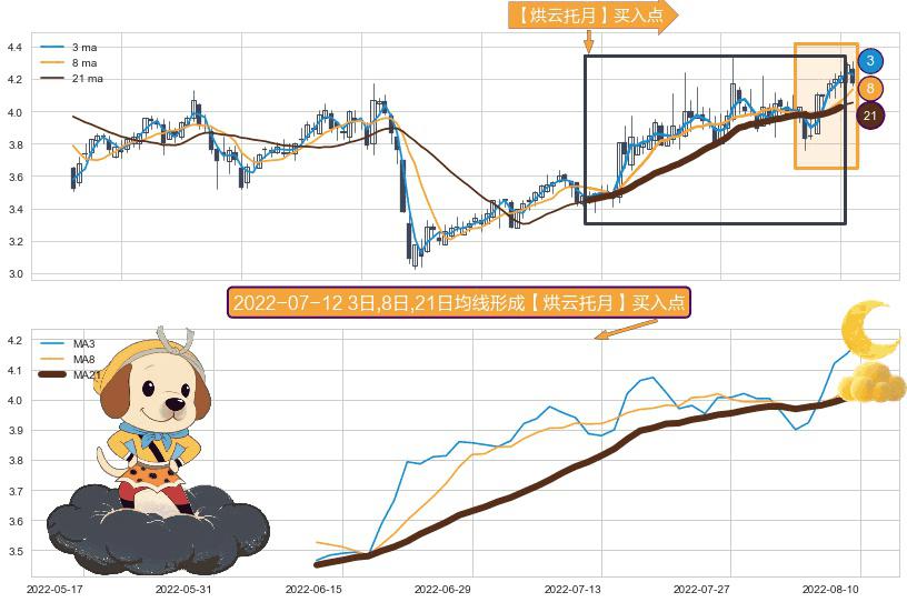 形态多维评估: ⚀ 2022-06-13日-2022-08-10日显现 3日-8日-21日均线 【烘云托月】买入点 看多信号,后市看涨,买入