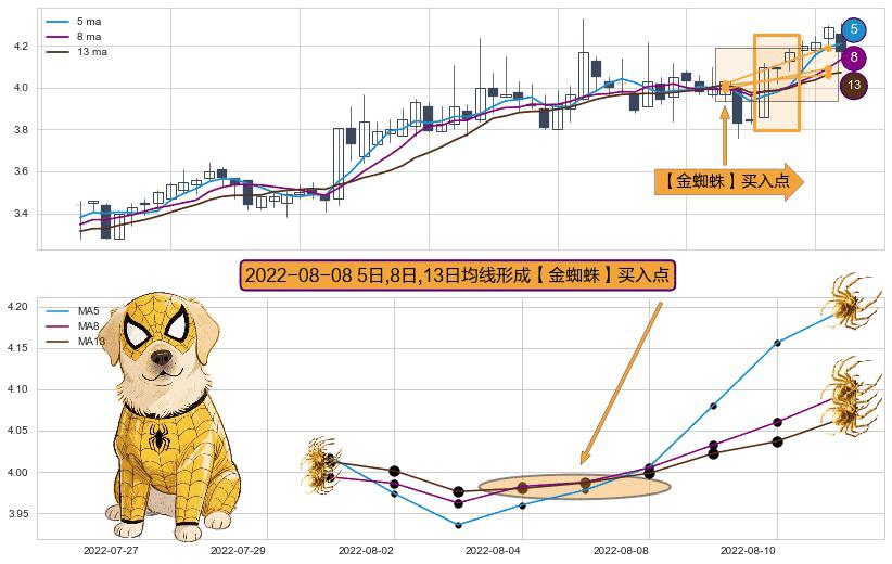 形态多维评估: ⚀ 2022-08-08日显现 5日-8日-13日均线 【金蜘蛛】买入点 看多信号,后市看涨,买入