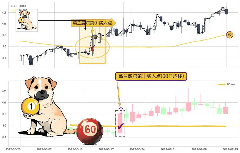 形态多维评估: ⚀ 2022-06-20-日显现 葛兰威尔均线 60日均线 第买①入点 走势反转见底信号,后市看涨,买进信号