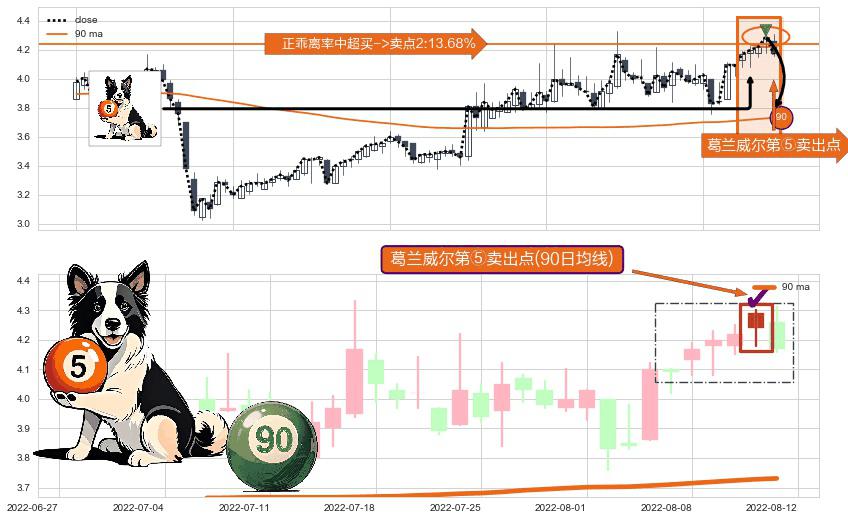 形态多维评估: ⚀ 2022-08-11-日显现 葛兰威尔均线 90日均线 第⑤卖出点 上升趋势均值回复的短线回落信号,后市看跌,卖出信号