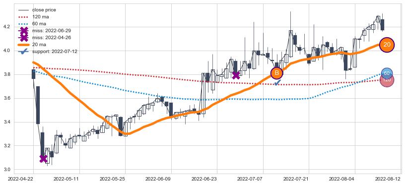 上涨趋势2022-04-22-2022-08-12,均线20确认关键支撑1处