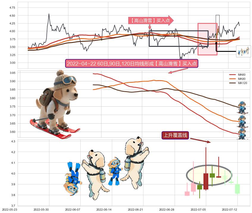 | 3 🅚:两红夹一黑 ➕ 🎢:【高山滑雪】买入点均线组合买入点信号形成后,猜想后续下行结束,持续反弹上涨(均值回复) ☞ 看多信号 ⇥ 【均线】交织【🅚线】⇥ 综合量化分数: 60 | > |