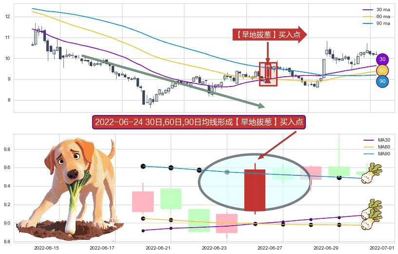 ⚀ 2022-06-24日显现 30日-60日-90日均线 【旱地拔葱】买入点 看多信号,后市看涨,买入
