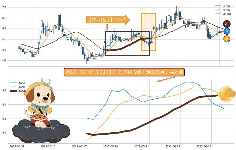 形态多维评估: ⚀ 2022-05-17日-2022-06-17日显现 3日-8日-21日均线 【烘云托月】买入点 看多信号,后市看涨,买入
