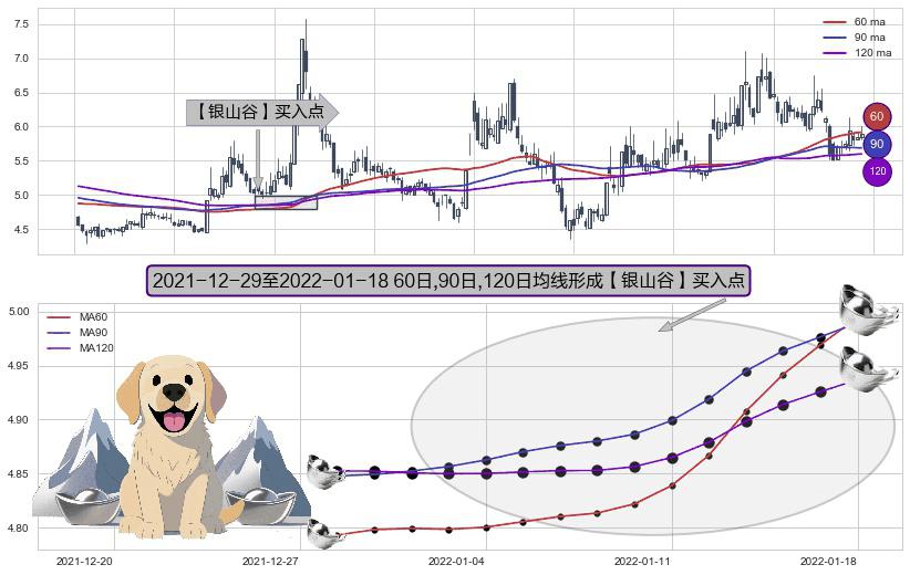 形态多维评估: ⚀ 2021-12-30-日至2022-01-18-日显现 60日-90日-120日均线 【银山谷】买入点 看多信号,后市看涨,买入