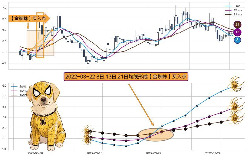 形态多维评估: ⚀ 2022-03-22日显现 8日-13日-21日均线 【金蜘蛛】买入点 看多信号,后市看涨,买入