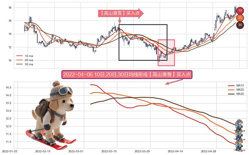 ⚀ 2022-03-03日-2022-05-11日显现 10日-20日-30日均线 【高山滑雪】买入点 看多信号,后市看涨,买入