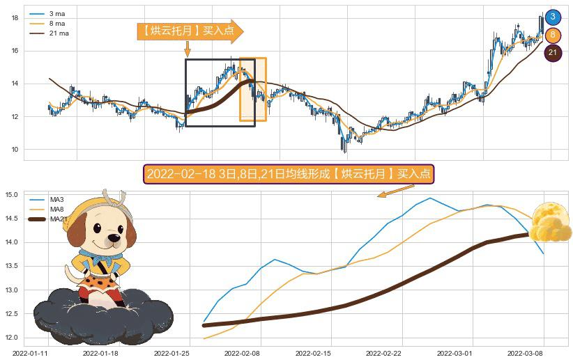 ⚀ 2022-01-26日-2022-03-08日显现 3日-8日-21日均线 【烘云托月】买入点 看多信号,后市看涨,买入