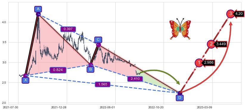 ➣ 未完成【蝴蝶】形态起点X: 2021-08-20, 已到达C点: 2022-04-08, 预测最终D点: 2022-12-06, 共312交易日