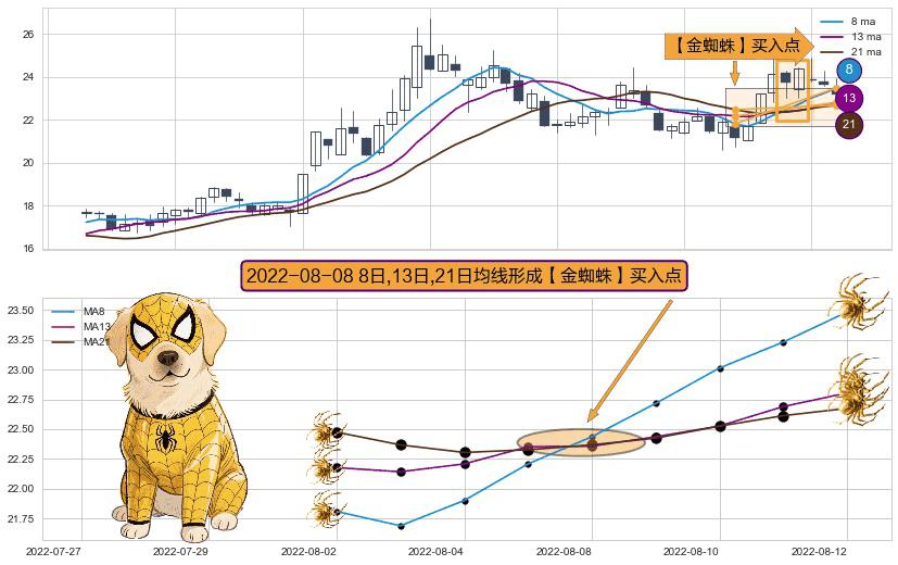形态多维评估: ⚀ 2022-08-08日显现 8日-13日-21日均线 【金蜘蛛】买入点 看多信号,后市看涨,买入