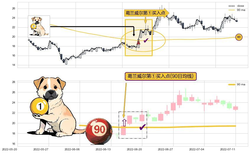 形态多维评估: ⚀ 2022-06-15-日显现 葛兰威尔均线 90日均线 第买①入点 走势反转见底信号,后市看涨,买进信号