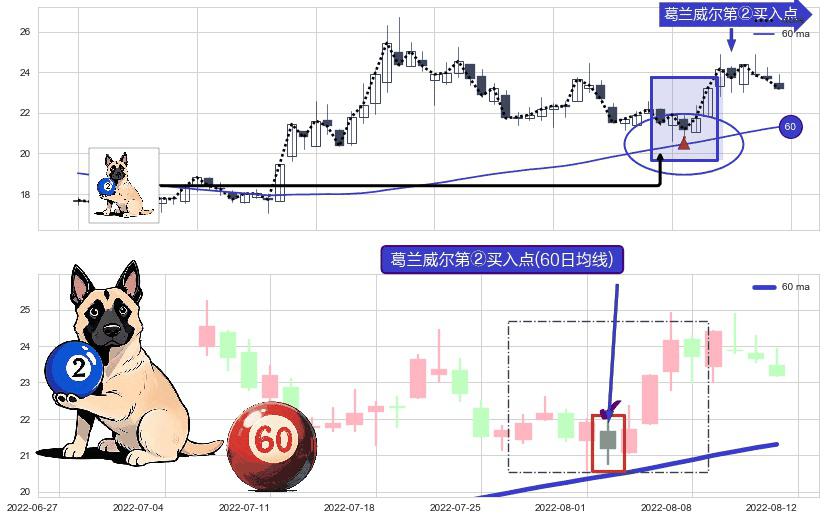 形态多维评估: ⚀ 2022-08-02-日显现 葛兰威尔均线 60日均线 第②买入点 上升趋势的中继信号,后市看涨,买进信号