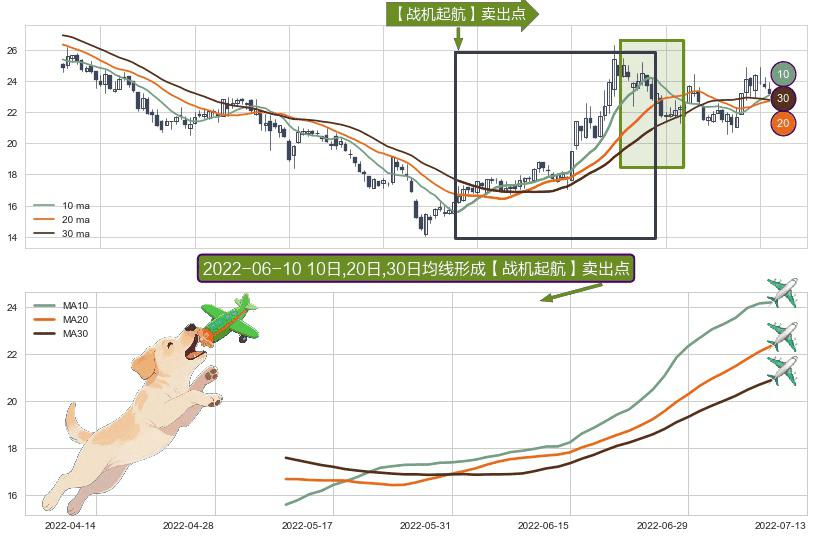 形态多维评估: ⚀ 2022-05-11日-2022-07-08日显现 10日-20日-30日均线 【战机起航】卖出点 看空信号,后市看跌,卖出