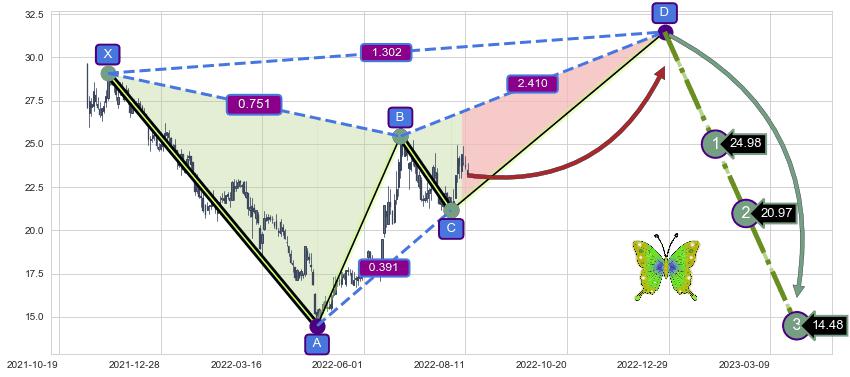 ➣ 未完成【蝴蝶】形态起点X: 2021-11-22, 已到达C点: 2022-08-02, 预测最终D点: 2022-12-27, 共272交易日