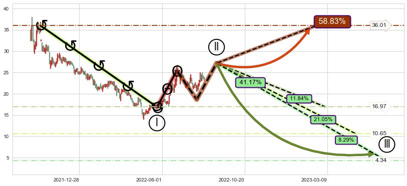 ➣ D点拟合预测价格17.74,距离最后交易收盘价格23.18相差 -23.48%