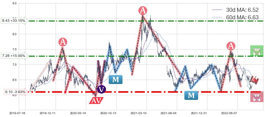 ♘ 支撑价格位6.10,可信任强度95.11%,距离最后交易2022-08-12形成的收盘价格6.33相差 -3.63%
