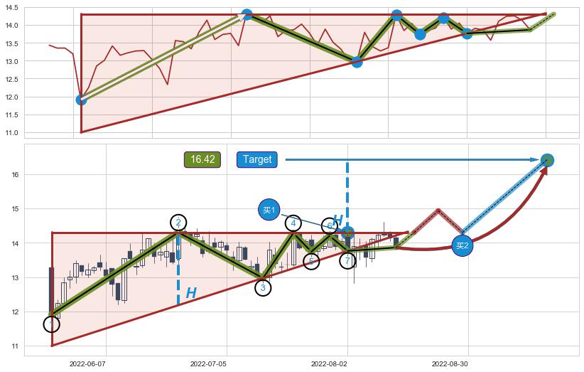➣ 最小中继整理涨幅→𝐇: 2.120 (上侧直角边第一阻力点②与斜边垂直距离)
