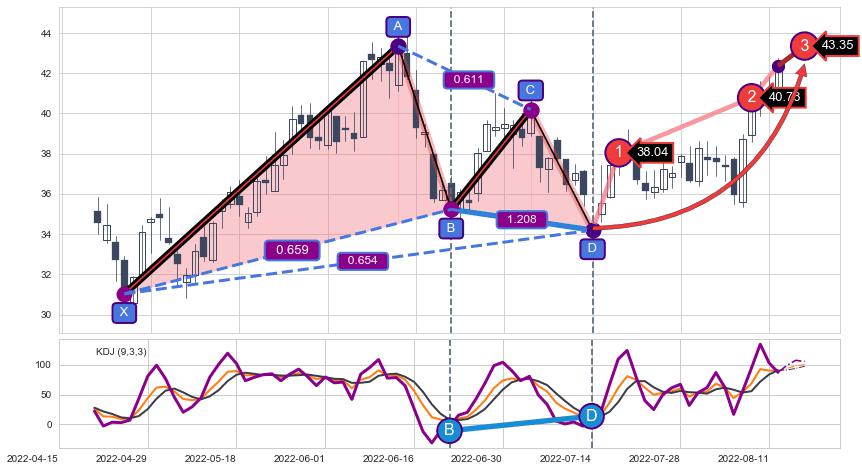 ➣ D点拟合预测价格43.89,距离最后交易收盘价格42.37相差 +3.59%
