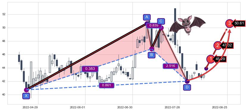 ➣ 已完成【蝙蝠】形态起点X: 2022-04-22, 终点D: 2022-08-02, 共69交易日