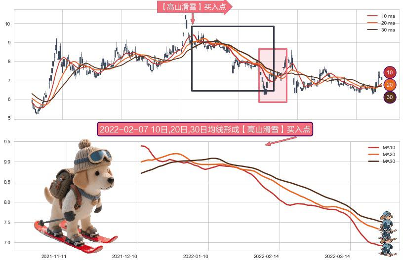 ⚀ 2021-12-13日-2022-03-25日显现 10日-20日-30日均线 【高山滑雪】买入点 看多信号,后市看涨,买入