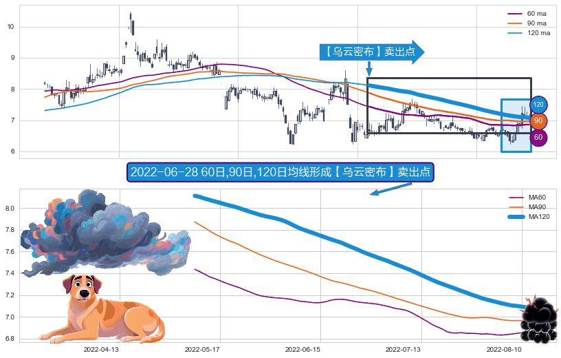 ⚀ 2022-05-10日-2022-08-12日显现 60日-90日-120日均线 【乌云密布】卖出点 看空信号,后市看跌,卖出