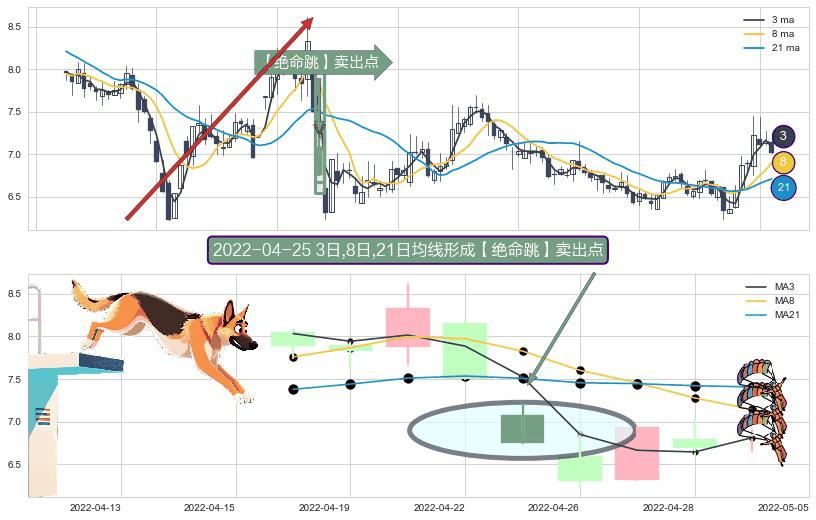 ⚀ 2022-04-25日显现 3日-8日-21日均线 【绝命跳】卖出点 看空信号,后市看跌,卖出