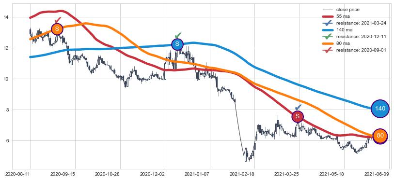 ⚁ MA60和MA90走势平行,且始终保持在短距离内,MA120始终在短中期均线上方,与短中期均线保持一定的距离,微微下行