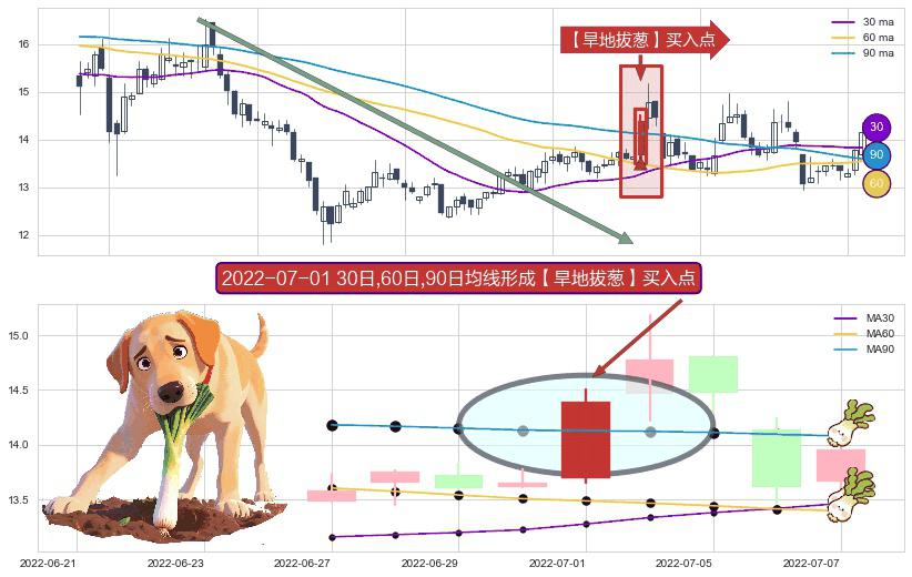 形态多维评估: ⚀ 2022-07-01日显现 30日-60日-90日均线 【旱地拔葱】买入点 看多信号,后市看涨,买入