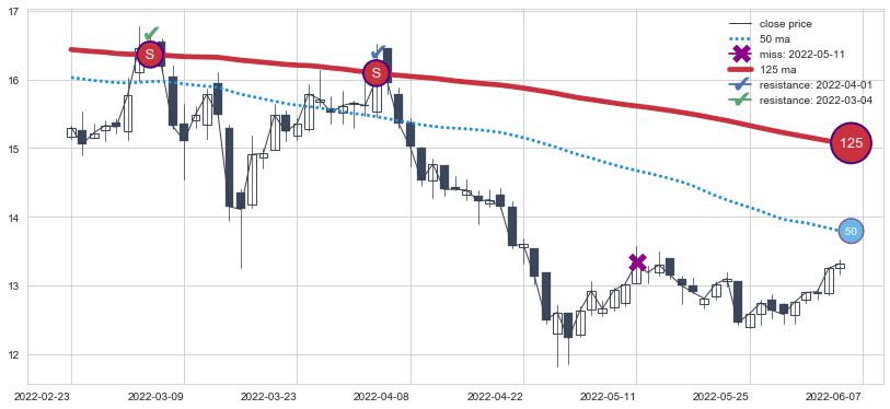 下跌趋势2022-02-23-2022-06-07,均线125确认关键阻力2处