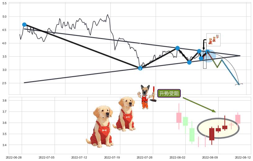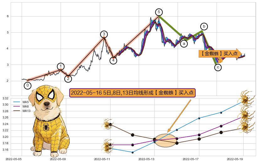 ➣ 高点影线(2022-05-11: 3.310 )→回踩→第一根k线低点(2022-05-05: 3.220 )