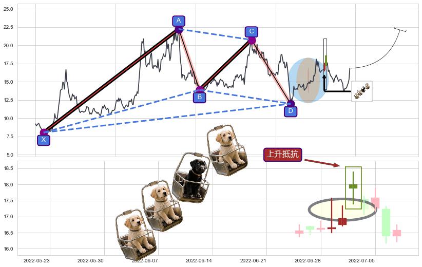 | 3 🅚:【旱地拔葱】买入点 ➕ 📡:谐波伽利已到达d点:猜想c下行到达d点后报复性拉升上涨(均值回复) ☞ 看多信号 ⇥ 【均线】交织【图形】⇥ 综合量化分数: 51 | > |