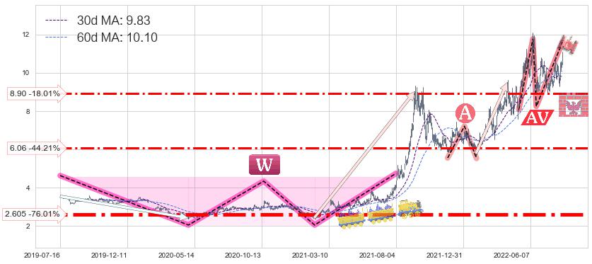 ♘ 支撑价格位6.06,可信任强度69.37%,距离最后交易2022-08-12形成的收盘价格10.86相差 -44.21%