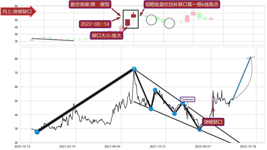 ➢ 收盘价(2022-06-22: 47.62 )→再次回踩→第一根k线高点(2022-06-13: 50.44 )