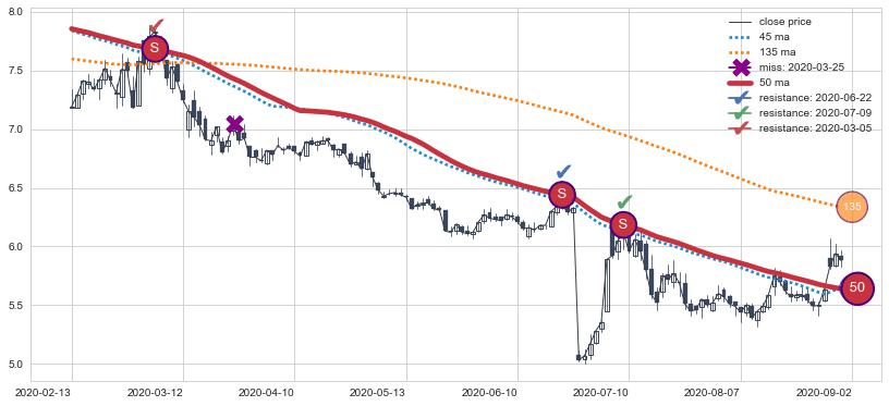 ➢ 最优均线组合共正确确认支撑阻力信号6处,正确确认率 66.67%