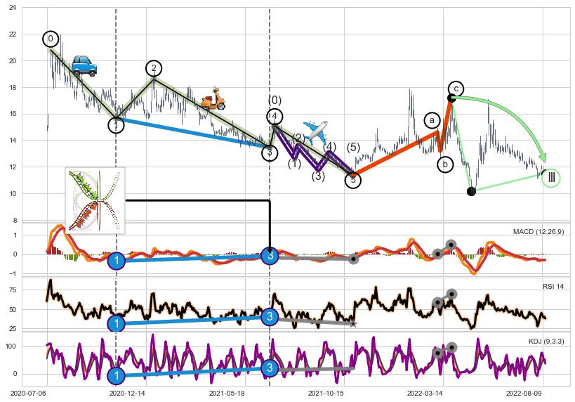➣ a,c调整浪MACD, RSI, KDJ走势都【未出现】背离,abc走势延续, 5浪反转概率增强