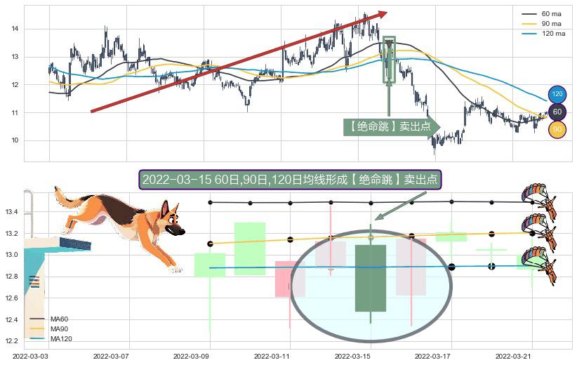 ⚀ 2022-03-15日显现 60日-90日-120日均线 【绝命跳】卖出点 看空信号,后市看跌,卖出