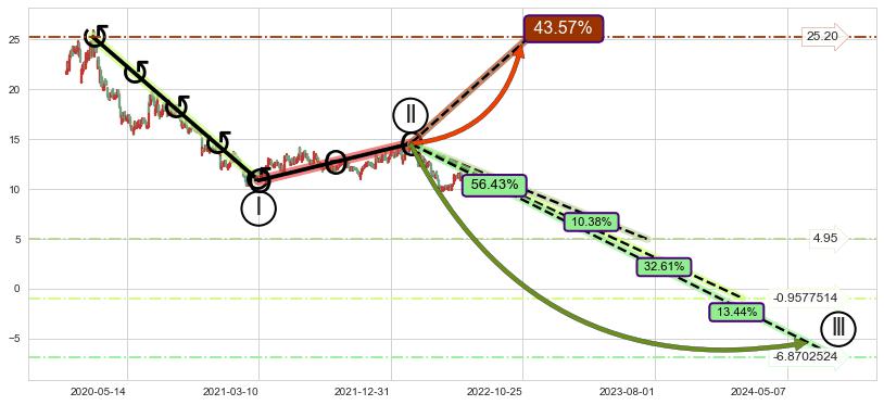 ➣ 调整浪已超过预测的c点位置,后续大趋势循环浪继续下跌概率56.43%,谨慎做多