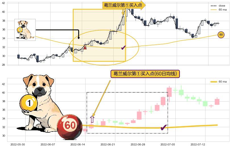 形态多维评估: ⚀ 2022-06-15-日显现 葛兰威尔均线 60日均线 第买①入点 走势反转见底信号,后市看涨,买进信号