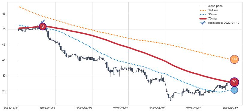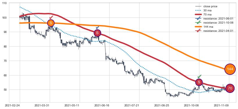 下跌趋势2021-02-24-2021-11-09,均线144, 70确认关键阻力3处