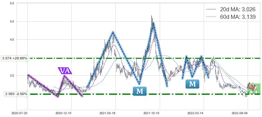 ♘ 阻力价格位3.974,可信任强度68.30%,距离最后交易2022-08-12形成的收盘价格3.060相差 +29.88%