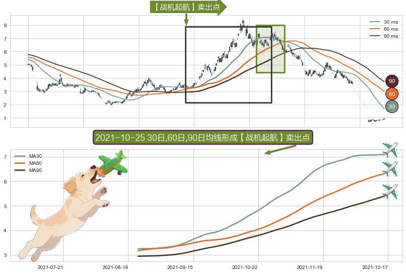 形态多维评估: ⚀ 2021-08-23日-2021-12-16日显现 30日-60日-90日均线 【战机起航】卖出点 看空信号,后市看跌,卖出