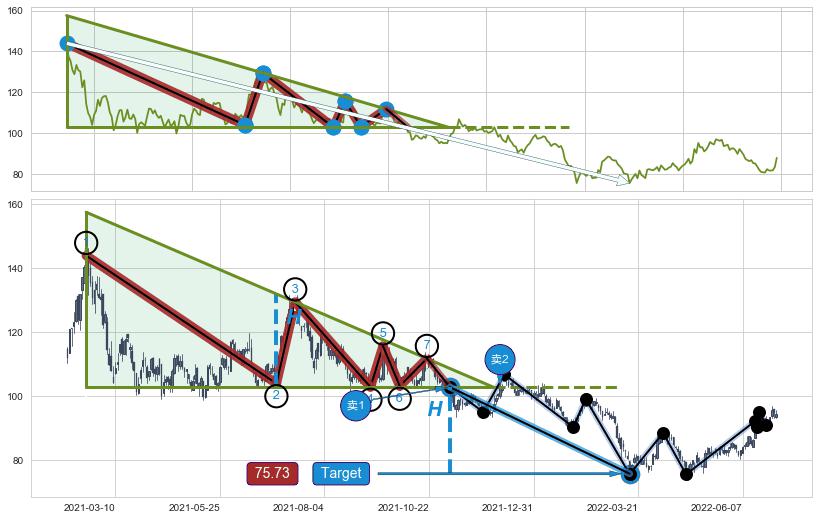 ➣ 最小中继整理跌幅→𝐇: 29.13 (下侧直角边第一支撑点②与斜边垂直距离)