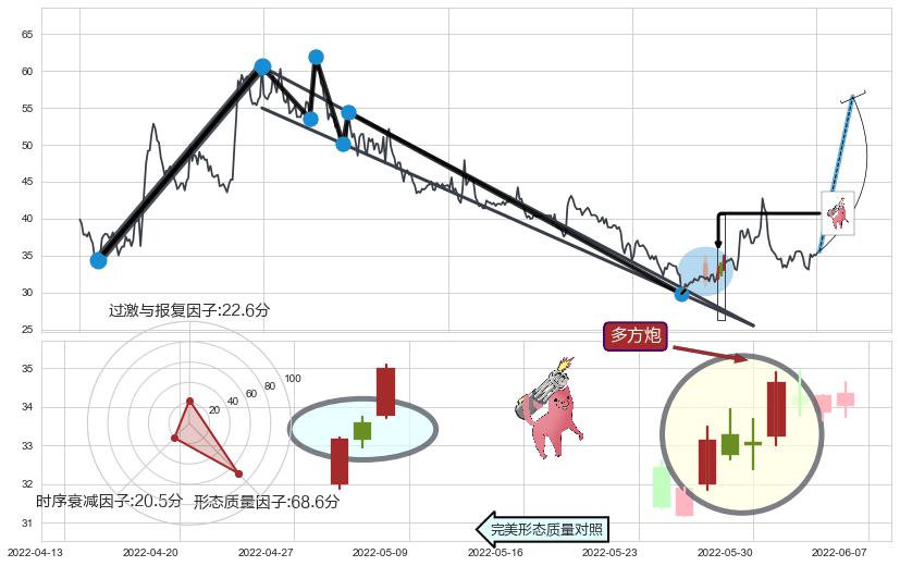 | 4 🅚:多方尖兵 ➕ 📐:降楔型向上突破击穿阻力位, 猜想持续拉升上涨,被突破的阻力位已变为支撑位 ☞ 看多信号 ⇥ 【🅚线】交织【图形】⇥ 综合量化分数: 53 | > |
