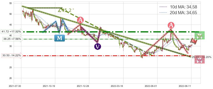 ♘ 阻力价格位38.25,可信任强度45.19%,距离最后交易2022-08-12形成的收盘价格35.56相差 +7.56%