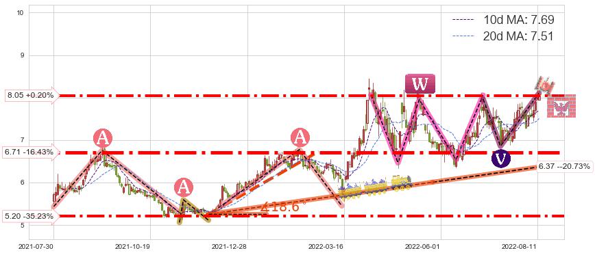 ♘ 支撑价格位6.71,可信任强度92.74%,距离最后交易2022-08-12形成的收盘价格8.03相差 -16.43%