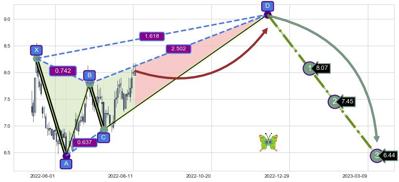➣ 未完成【蝴蝶】形态起点X: 2022-05-16, 已到达C点: 2022-07-15, 预测最终D点: 2022-12-09, 共149交易日