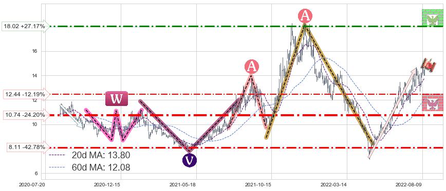 ♘ 阻力价格位18.02,可信任强度56.99%,距离最后交易2022-08-12形成的收盘价格14.17相差 +27.17%