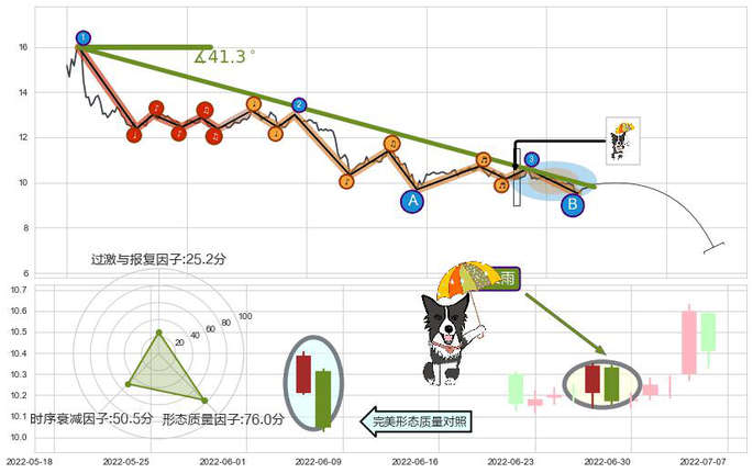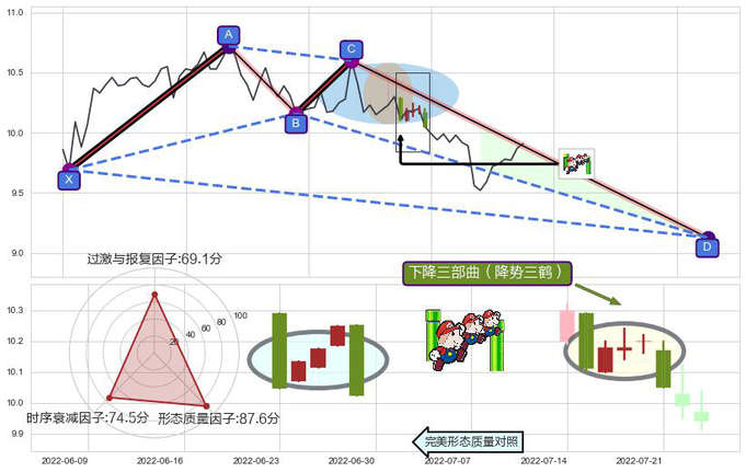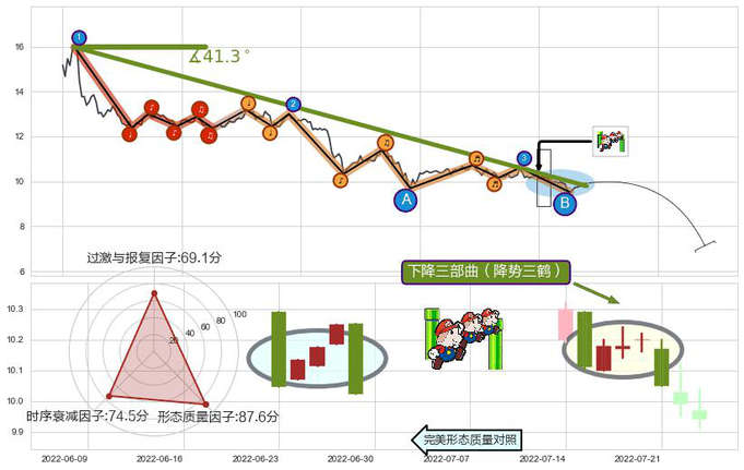➢ 🕰 价格走势在2022-07-15至2022-07-21期间形成下降三部曲(降势三鹤),残存影响值:-6.15