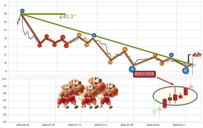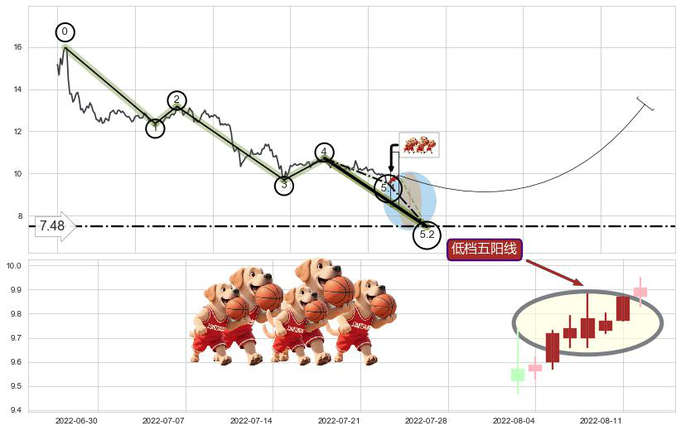 ➢ 🕰 价格走势在2022-08-05至2022-08-11期间形成低档五阳线,残存影响值:5.91